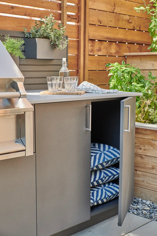 We often focus solely on cooking when thinking about outdoor cabinetry, but cabinets can also be used for so much more. Consider including custom storage solutions for soft goods and smaller outdoor appliances to protect them when not in use.