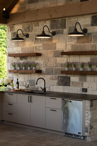 In this project by Frontiers Design + Build and Paragon Kitchens, the stone surround emphasizes the warmth of our Clay finish. Complemented by black bronze handles, dark iron light fixtures, a Dekton Radium countertop, and solid wood shelves, the harmonious vignette blends seamlessly with the natural surroundings.