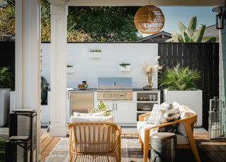 In this inviting Southern California outdoor entertaining space, Chantilly blends with organic tones, natural wood flooring, woven rattan furniture, and bohemian-style lanterns and cushions to create a warm and relaxing atmosphere.