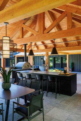 It was the perfect finish to create a timeless aesthetic for this outdoor space in a historic neighborhood outside of Boston by Bell Design Studios. The light gray countertop with flecks of brown picks up the warm undertones of the cabinet finish for a beautiful contrast.