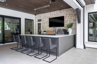 One of the key design goals was to extend the home's interior aesthetic into the outdoors to create a seamless transition. Genesis Kitchens expertly achieved this by pulling the home’s existing black metal accents, visible in window frames and lighting fixtures, directly into the outdoor space, complimenting the contemporary farmhouse style of the home. Stone cladding along the wall and wood panelling on the ceiling highlight the natural beauty of the British Columbia landscape, while adding warmth and comfort to the space.