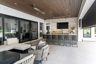 The ultimate outdoor kitchen is the heart of this functional retreat, designed around the homeowners' desire to prep, cook, and entertain without ever stepping indoors. A U-shaped configuration proved to be the perfect solution, placing prep areas against the wall while leaving an open peninsula with an overhang for casual seating. Echoing the interior design, Urban Bonfire’s elegant Artesan powder coating finish and Black Bronze handles match the dark metal detailing found in the rest of the home. This sophisticated space is fully equipped with a sink, an outdoor refrigerator, a spacious 48" grill, and a mounted TV.