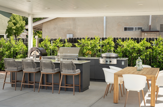 Cette cuisine extérieure du sud de la Californie intègre parfaitement un gril à gaz, un gril à surface plate et un four à pizza ainsi que divers appareils extérieurs sous le comptoir pour un paradis pour les artistes.
